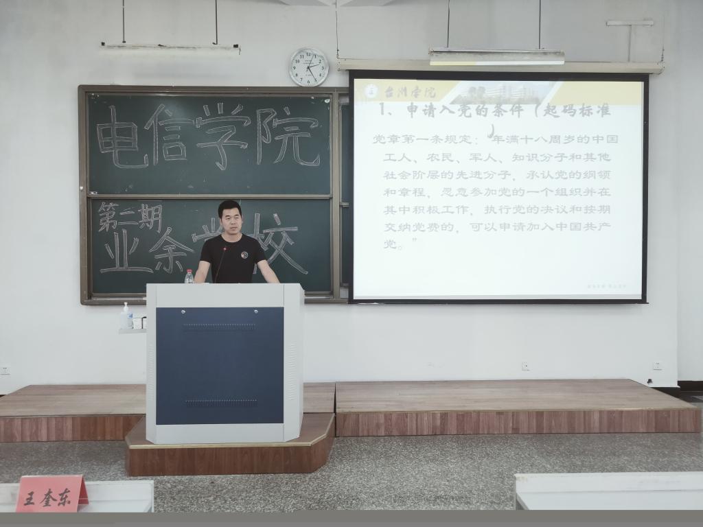 5月24日,太阳集团tcy8722分校区举办第二期业余党校开学典礼暨党课开课仪式。公司党总支书记王奎东、副书记冯荣分别作开班动员讲话并为学员授课。物理与电子员工党支部书记陈敏、分团委书记沈迪分别主持仪式,员工党员代表、先锋队成员及202名入党积极分子参加。