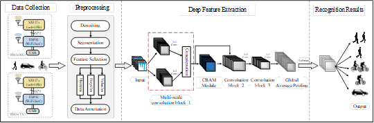 针对智能交通系统数据供给侧存在采集成本过高且部署难等问题,上述成果提出了基于无线感知的人车识别方法,该方法以现有无线传感器网络为基础,通过建构深度学习模型,挖掘人车作用下电磁波能量属性背后的敏感信息,实现行人、车辆和混杂交通模式等场景识别和测量,为智能交通系统提供低成本和高准度数据支撑。相关模型如下图所示。