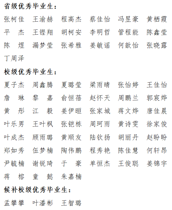根据《太阳集团tcy8722本科生评优奖励办法》,经班级推荐、学工办审核、公司党政联席会议研究决定,决定推荐张柯佳等19位同学为省级优秀毕业生人选,夏子杰等45位同学为校级优秀毕业生人选,孟攀攀等3位同学为候补校级优秀毕业生人选。具体名单如下: