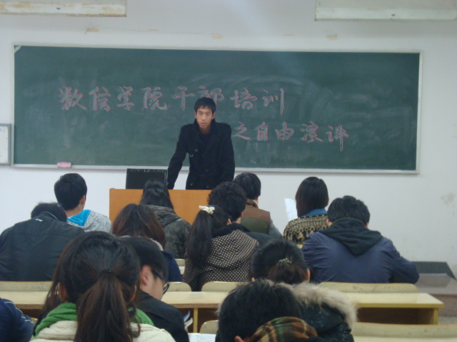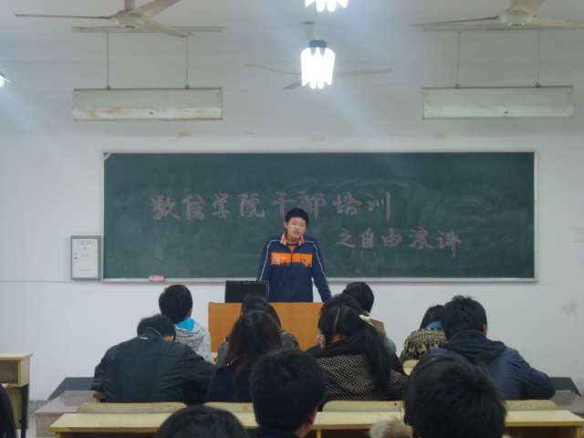 本次演讲主要是面对所有员工干部展开。所有员工干部自由上台演讲,主题不限。在主持人宣布开始之后,各部门的干事都踊跃上台演讲,有的畅谈理想和人生,有的总结过去展望未来。大家都踊跃地发表自己对进入团学会这段期间的感想。课堂气氛在所有同学的积极参与下不断活跃。