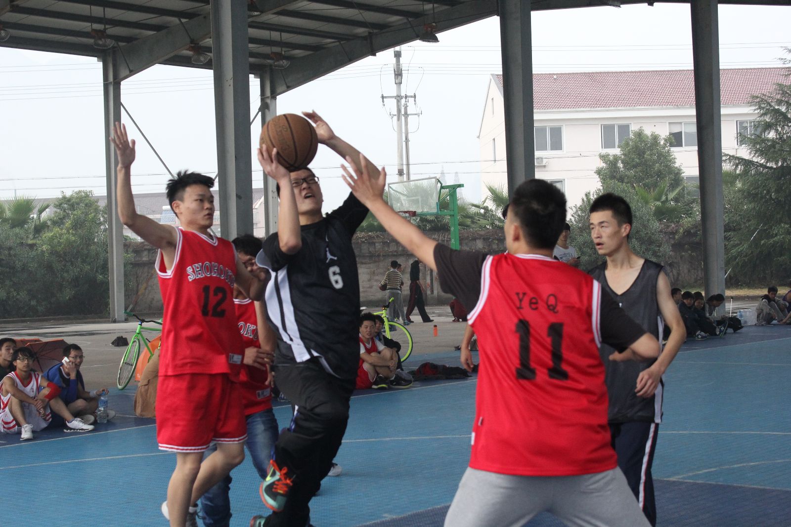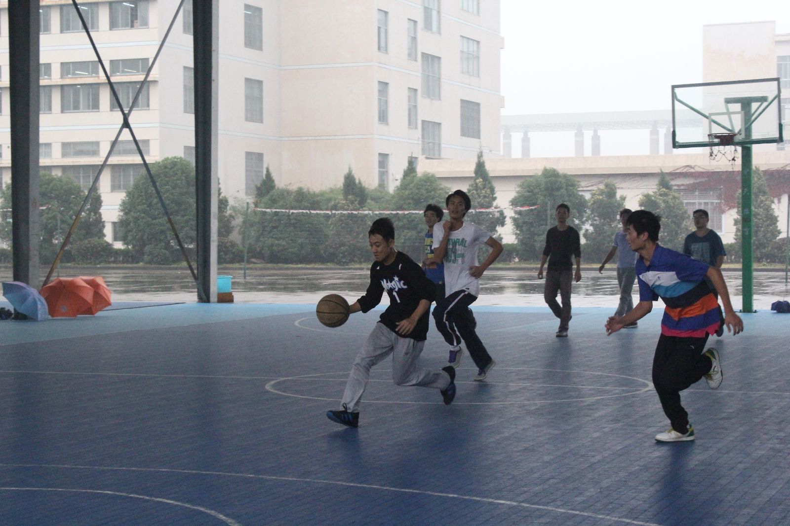 比赛分专业进行,一场定胜负。运球、快攻、长传、翻转、远投招招夺人眼球。由于天气潮湿,不少选手滑倒负伤但他们立马“腾空而起”继续比拼。随着比赛推进,场上你争我夺,场下呐喊不断。最后,13计应,12信管,13数学,13计教在各自比赛中脱颖而出,一举夺冠。