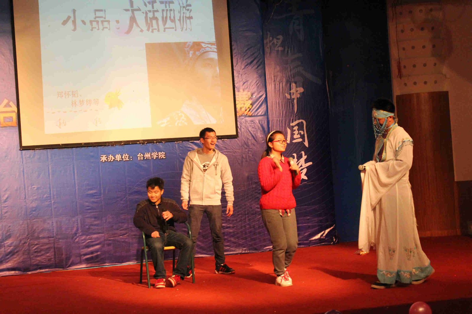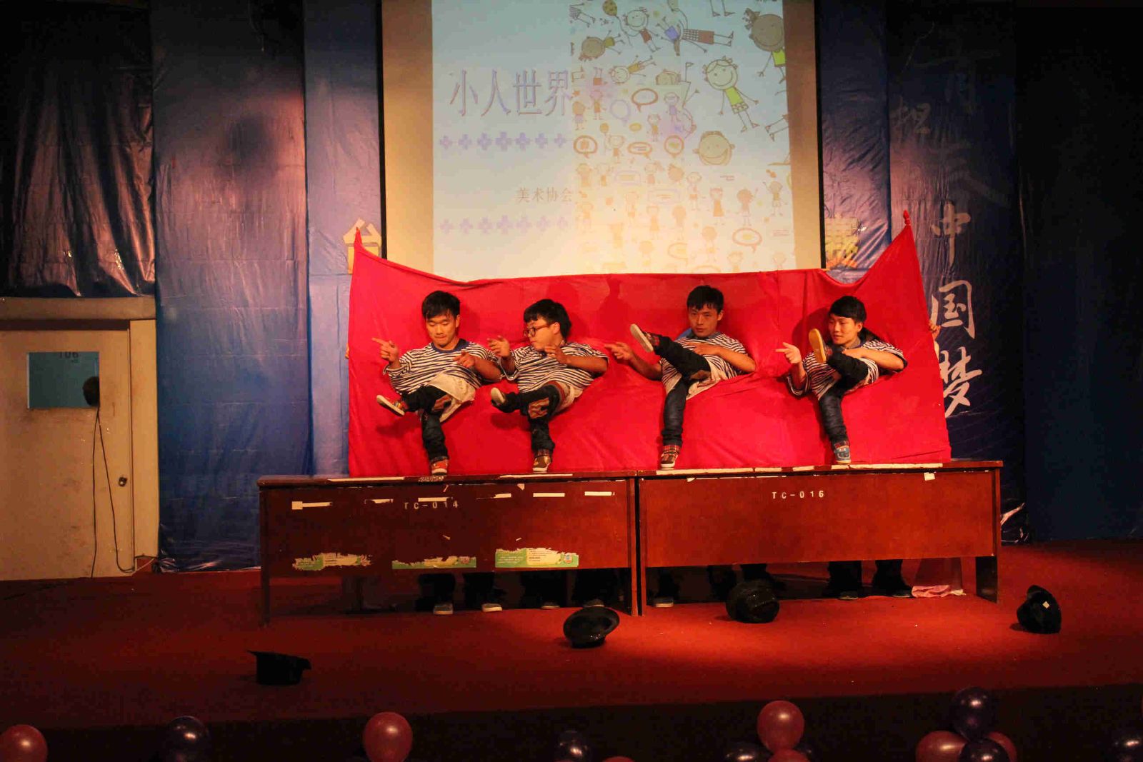 活动伊始,7号车库乐队就奉上了两首劲歌,随后是美术协会带来拿手好戏“小人世界”。饕餮眼福之后,四大社团均有带来独家节目。歌曲串烧《台院那些事》笑点频频,原创话剧《大话西游》博得笑声连连,方言朗诵《士兵心曲》创意无限,一曲《希望》歌声绕梁三匝……期间穿插的游戏环节,更是使晚会气氛跌宕起伏。