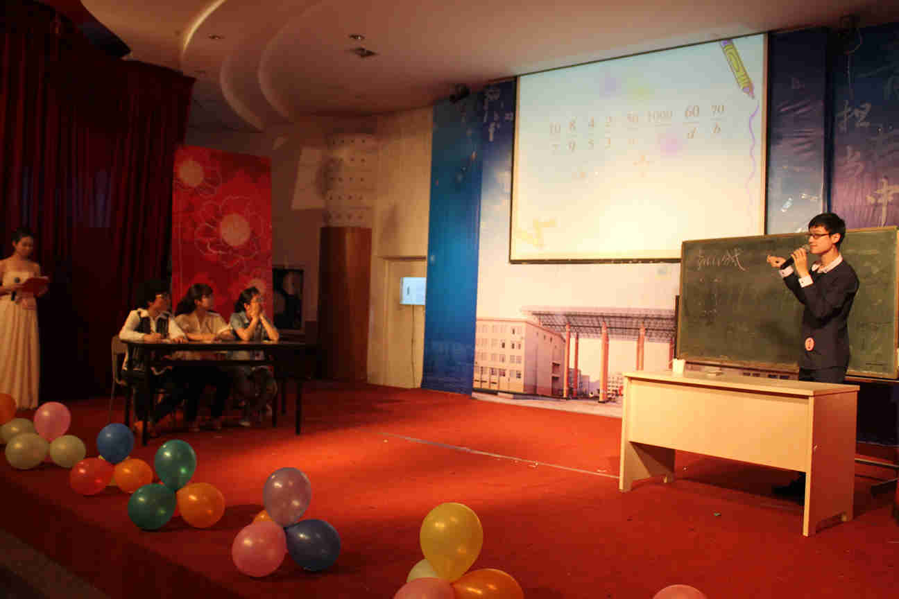 一首《每当我走过老师窗前》的合唱拉开了晚会的帷幕。晚会主要分你说我评,大众投票,师王争霸三轮展开。经过初赛洗礼的九位选手通过PPT展示并结合板书为大家带来不一样的课堂,在此过程中更有互相点评和评委点评。师王争霸中,分别为选手模拟了四种不同的情景,综合各方面考验了选手的应变能力。由于各位选手能力奇虎相当难决胜负,还外加了一轮绕口令进行角逐。最后12数学的林炯毅赢得本届师王宝座。