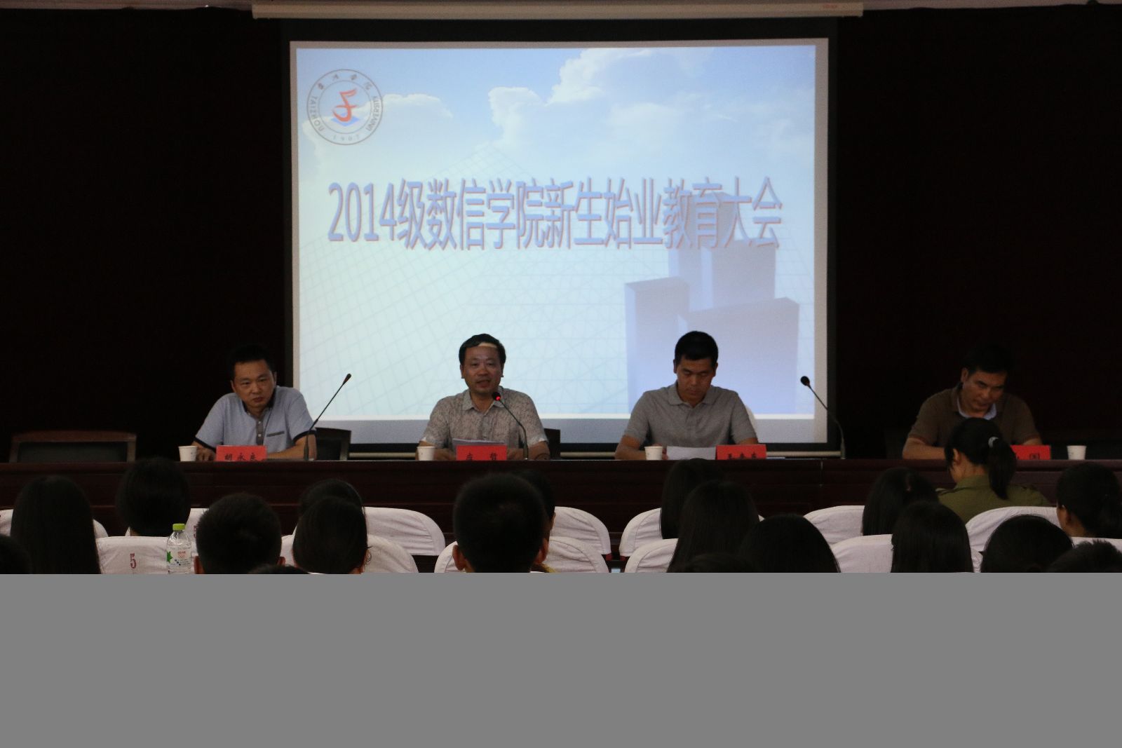 9月15日下午,数信公司在临海校区学术报告厅举行2014级新生始业教育动员会。公司党政领导应哲、王奎东、胡永良、冯国,系主任、班主任及辅导员出席大会。