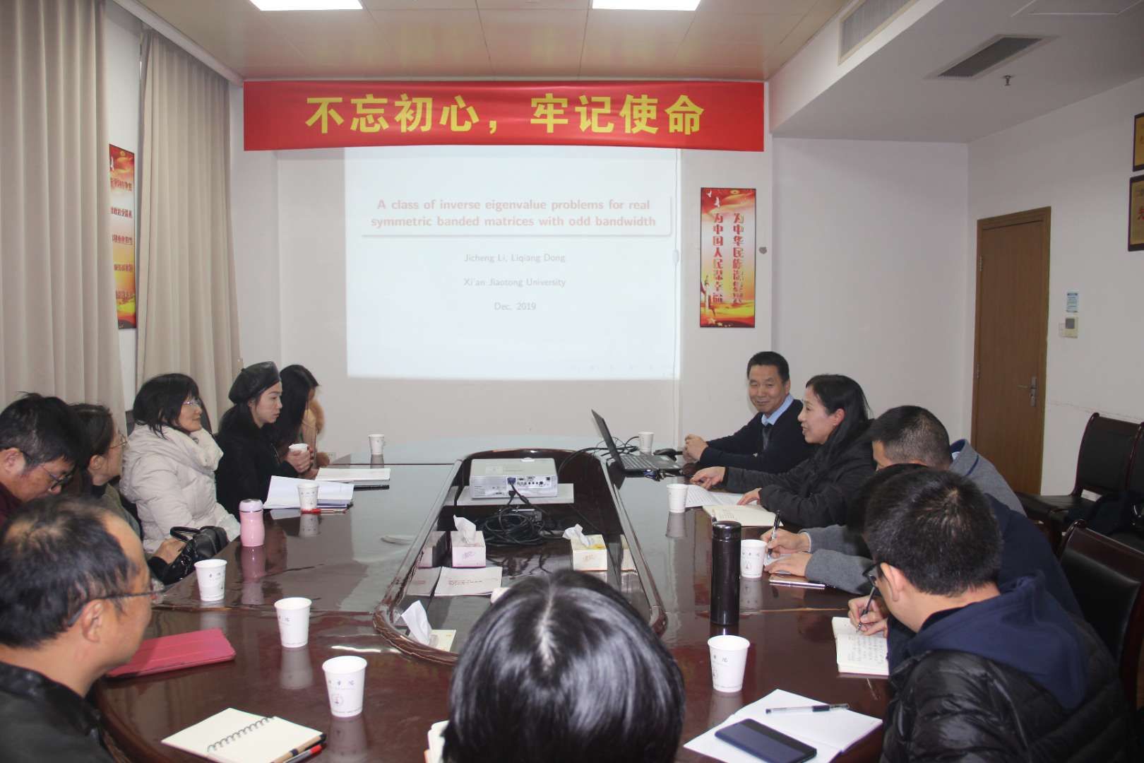 12月20日,应太阳集团tcy8722邀请西安交大数学与统计公司副经理李继成教授来校作“A class of inverse eigenvalue problems for real symmetric banded matrices with odd bandwidth”专题讲座。太阳集团tcy8722副经理苏岐芳教授主持,太阳集团tcy8722数学研究所全体成员参加。