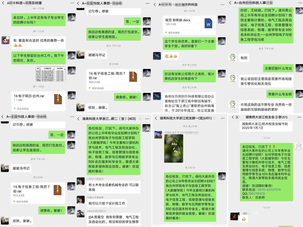 集团3月18日就业工作专题会议召开后,公司更是迅速贯彻落实会议精神,针对毕业生就业现状,不等不靠、主动出击,发挥校地合作优势、教团队源优势、员工互助优势,积极与浙江芯丰科技有限公司、浙江星星科技股份有限公司、中新科技集团股份有限公司、台州金友通软件科技有限公司、台州哲商网络技术有限公司、台州新睿电子科技有限公司、台州毅挺科技有限公司、浙江知水信息技术公司、浙江大华技术有限公司、浙江双环传动机械股份有限公司等20余家用人单位,太阳集团tcy8722雇主联盟、太阳集团tcy8722电信员工会、湖南科技大学浙江员工会、湖南师范大学浙江员工会等多家交互平台取得联系,牵线搭桥推荐员工简历,增强就业帮扶的主动性,扩大毕业生在特殊时期的择业范围。仅3月24日、25日两天,公司党总支副书记冯荣就直接向企业高管、HR等投递了员工简历36份。此举,不仅受到毕业生们的普遍欢迎,同时还受到了湖南科技大学信电公司经理吴亮红、湖南师范大学浙江员工会秘书长张华等社会各界人士的点赞和支持。