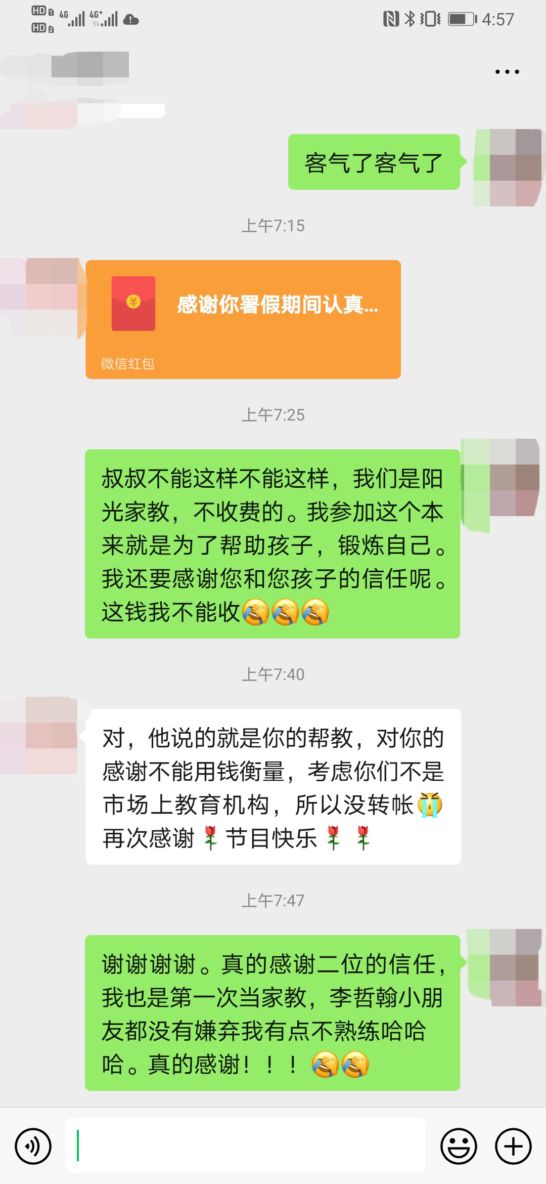 本次“阳光家教”暑期实践活动虽然已经结束,但留给所有人的影响和意义深远。就像季同学所说,本次公益阳光家教对他而言是一次不错的锻炼和实践的机会,在和小朋友的相处中也感受到了幸福和满足,很开心能够帮助到他们。传递知识,传播爱心,“阳光家教”的温暖还在传递,太阳集团tcy8722学子定将不忘初心,砥砺前行!