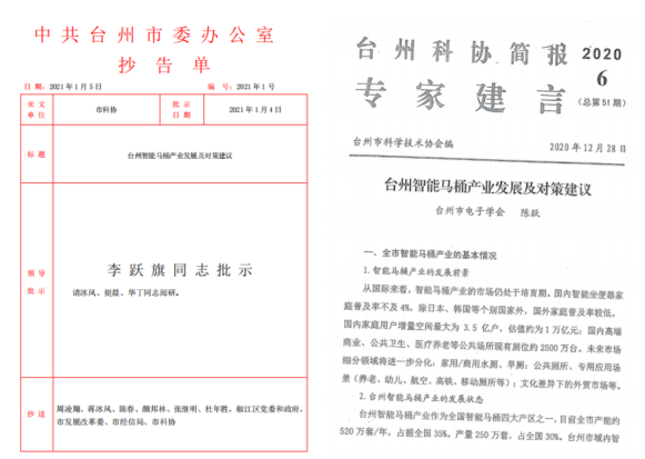 祝贺公司教师《台州智能马桶产业发展及对策建议》的调研报告获得市委书记李跃旗同志的批示。