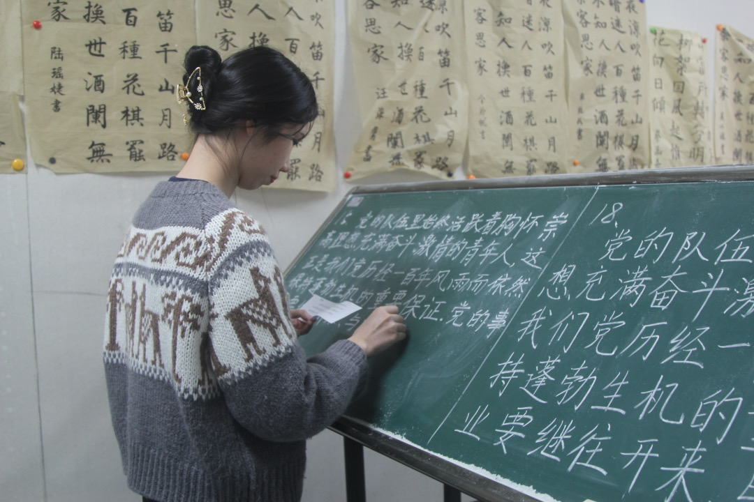 比赛分毛笔组、钢笔组与粉笔组依次进行。参赛选手们铺纸润笔,奋笔疾书,全心投入,精心书写。钢笔字端正隽秀,刚劲有力;粉笔字字正方圆,清秀苍劲;毛笔字运笔纯正,雄健有力。