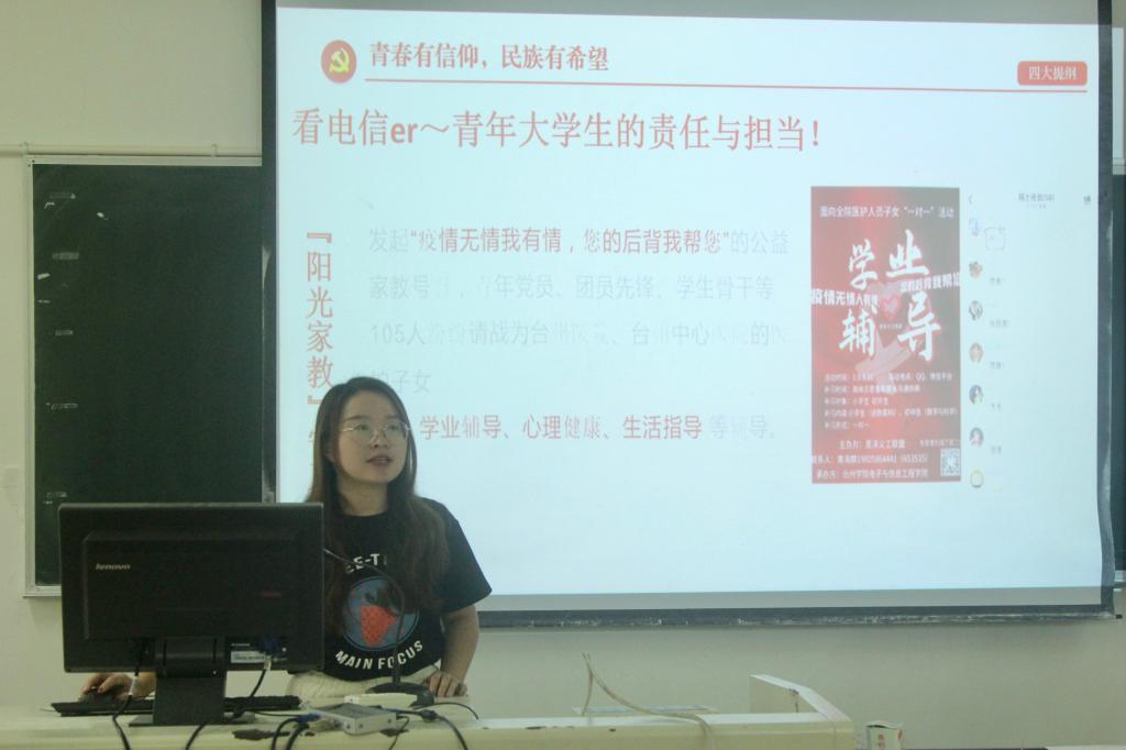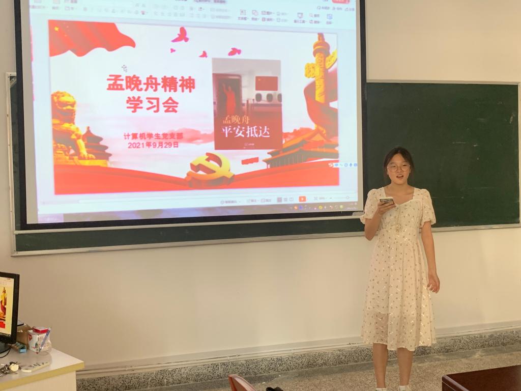 辅导员吴佳妲向同学们讲解了孟晚舟事件的实质,以及孟晚舟回国的深刻意义:何止是孟晚舟,每当我们的同胞遇到危难时,祖国总会在关键时刻及时出手,做同胞的“诺亚方舟”,做人民的安全卫士。一句“祖国接你回家”折射出人民至上的执政理念,凸显了一个大国的自信与力量。作为中华儿女的命运共同体,强大的中国是每个中国人的坚强靠山,祖国繁荣昌盛也是所有中国人的心愿!作为电信学子,我们更要在今后的人生历程中,展现青年老员工的责任与担当!
