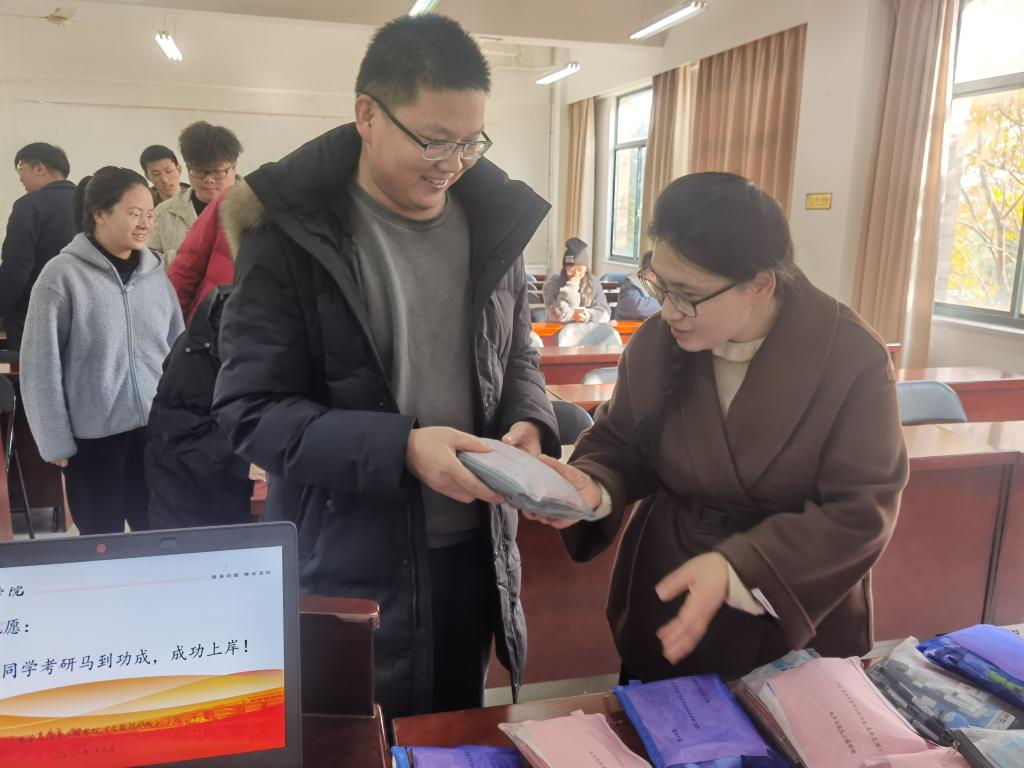 与会老师为考研员工一一发放了公司精心准备的考研加油包,使考研学子感受到来自公司的关怀与温暖。考研加油包里的文具用品、生活用品等,都由公司集思广益,精心挑选,点滴之间都透露出公司真挚的祝福和鼓励。