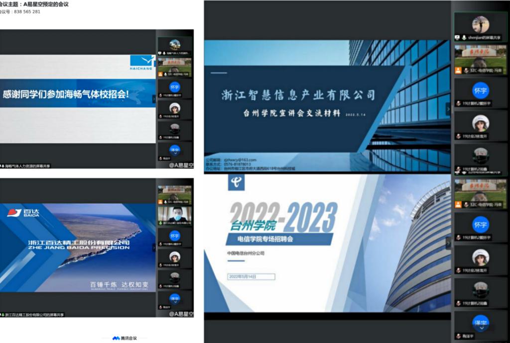 本次线上就业实习双选会共有20余家企业报名,经专业匹配度、岗位需求度筛选,共组织18家用人单位进行线上宣讲,实际提供就业岗位和实习岗位近300个。线上招聘会各用人单位宣讲内容紧凑,专业匹配度高,现场员工反响热烈,毕业班员工根据近期的实习经验,大三员工根据自己的职业规划,均和心仪用人单位进行了有针对性的深入了解和交谈,部分员工通过线上添加用人单位联系人或投递简历。其中,中国电信台州分公司、浙江伟星实业发展股份有限公司、浙江正泰中自控制有限公司等国企、上市公司备受员工关注。