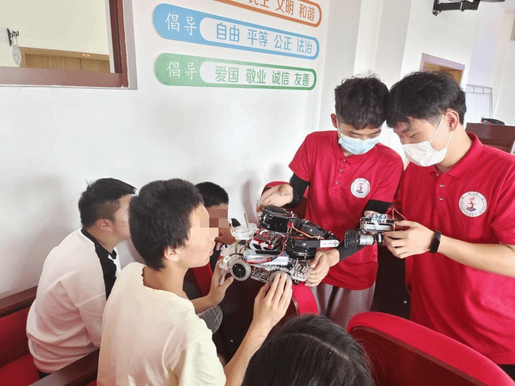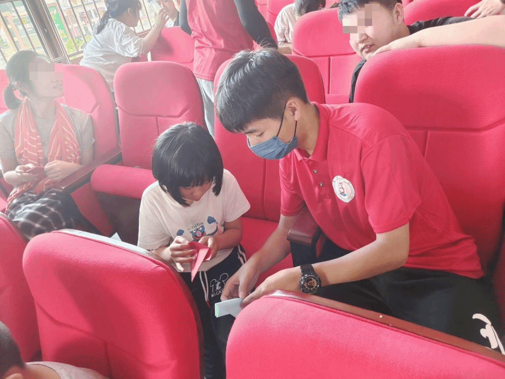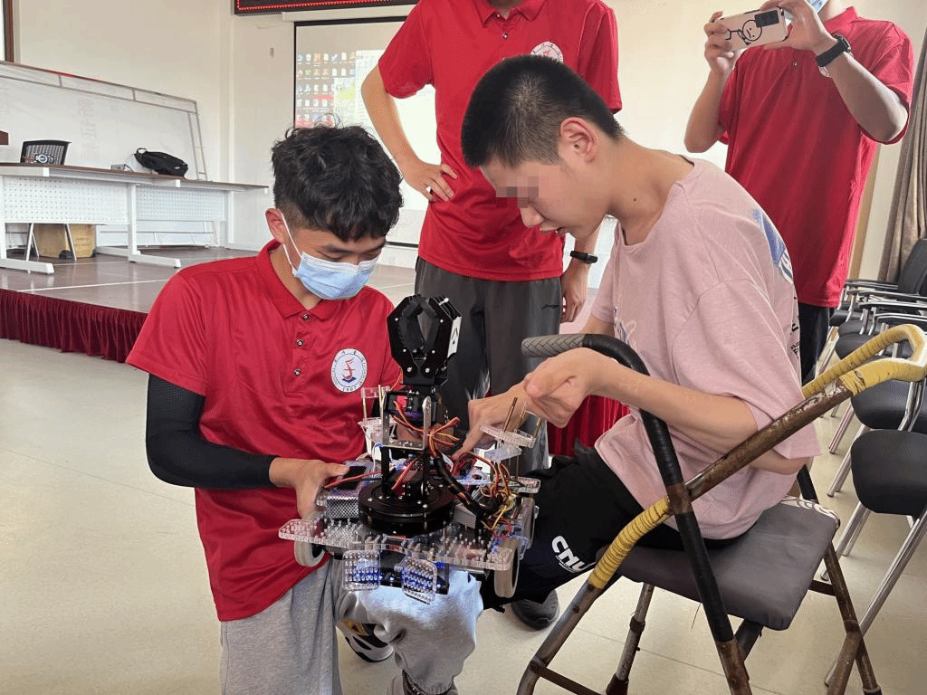 实践队兵分两路,一路实践队队员为培智公司的孩子们带来了智能小车、机器人,通过对照实物和观看视频讲解,实践队向孩子们形象地展示了小车的结构和功能,吸引了孩子们好奇的目光。讲解后,实践队队员带着实物来到孩子们中间,和孩子们近距离的互动,场面十分温馨热烈。之后,实践队同孩子们一起进行手工折纸,有的折成了飞机,有的折成了小船,还有的折成了青蛙,现场一片欢声笑语,孩子们脸上洋溢的真诚笑容让人动容。