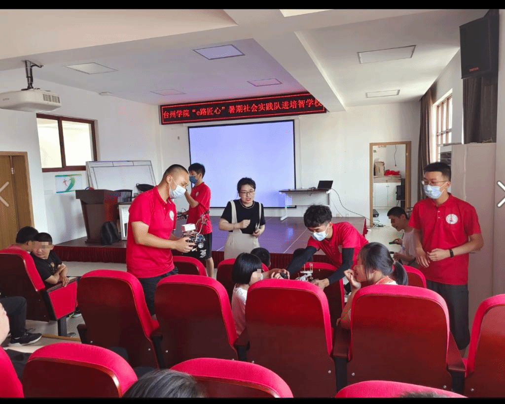 实践队还来到台州市培智公司,为培智公司的孩子们带去了智能小车、机器人,队员们对照实物和视频进行讲解,还拿着实物和孩子们近距离的互动,孩子们增长了见识。实践队同孩子们一起进行手工折纸,有的折成了飞机,有的折成了小船,还有的折成了青蛙,场面十分温馨热烈。另外,实践队为椒江剪纸名家、区剪纸非物质文化遗产传承人杨计兵老师做助教,陪着孩子们画图,剪纸,辅助他们完成作品。