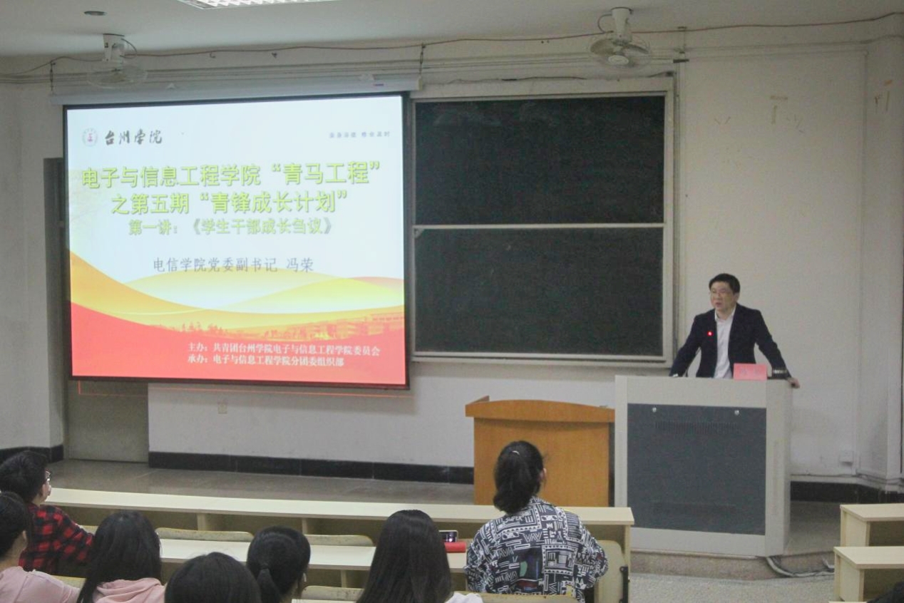 为提高员工干部的综合素质,提升业务能力,端正工作作风,帮助他们树立正确的人生目标与职业规划,10月14日晚,太阳集团tcy8722启动2022年“青马工程”暨第五期青锋成长计划,并在临海校区A5大教室同步组织举行了第一讲。电信公司党委副书记冯荣应邀出席并主讲,第五届分团委、员工会全体干事和2022级各班班委到场参加讲座。