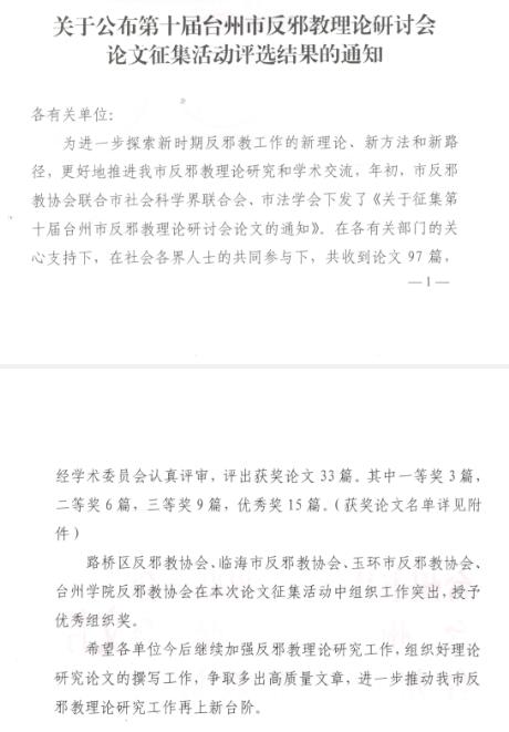 在近期举行的第十届台州市反邪教理论研讨会征文活动中,公司荣获优秀组织单位称号,同时公司师生共有5篇论文分获二等奖、三等奖及优秀奖。