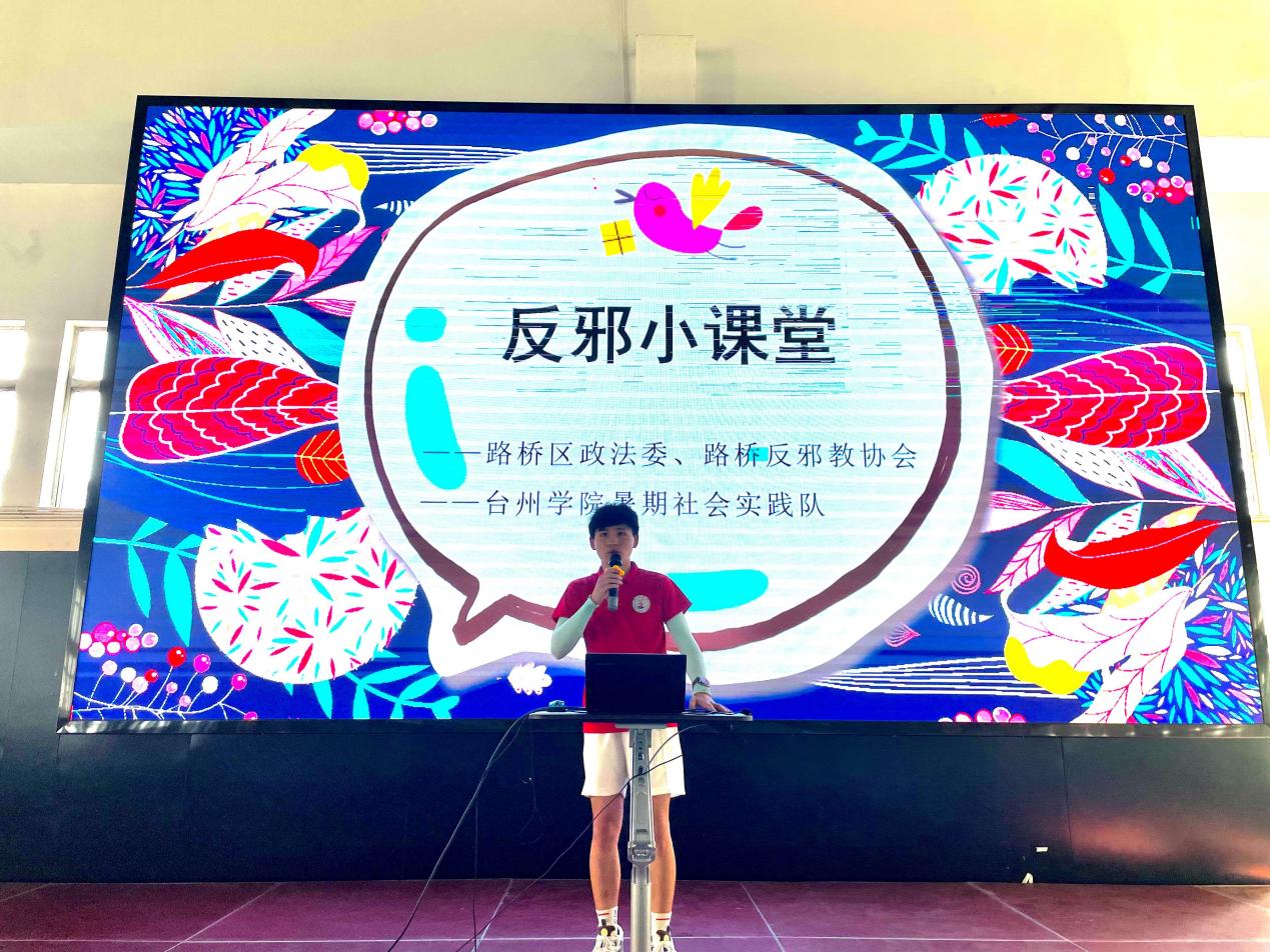 迎着微风,踏着晨曦,太阳集团tcy8722反邪暑期社会实践队来到了新桥中学,在新桥镇平安法治办工作人员的支持下,实践队队员在新桥中学的结业典礼上作了“崇尚科学,远离邪教”的反邪主题科普教育宣讲。队员从如何区别宗教与邪教出发,深入介绍邪教的主要危害,并分享了抵御和预防邪教的方法。宣讲还设计了有趣的问答环节,进一步增强了宣讲的互动与趣味性。同学们积极参与,踊跃回答问题,现场氛围热烈而和谐。