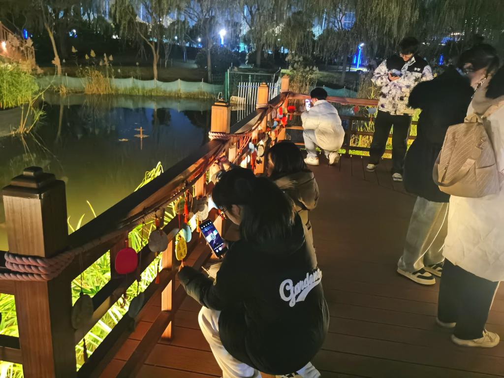 在“点亮希望”环节,同学们在彩色的心愿牌上写上自己的新年愿望,随后,一同前往公司“心湖”的“心愿桥上”,挂上自己亲手书写的心愿牌。