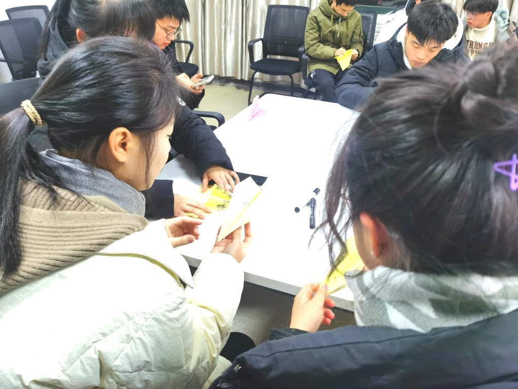 此次趣味活动分为两个环节:“放飞烦恼”和“点亮希望”。在“放飞烦恼”环节,同学们将近期或一直以来的烦恼或压力以匿名的形式写在彩纸上,随后,将彩纸折成纸飞机,从活动室尾部飞向讲台的位置。接着,工作人员随机捡起部分纸飞机打开,阅读烦恼内容,大家共同提出解决方案,并就这些话题展开讨论。同学们的烦恼和压力多种多样,如课程学习上、考前和考后焦虑应对、恋爱、个人成长、亲子关系等等,但在飞出“烦恼纸飞机”的那一刻,活动室里洋溢着轻松、愉快的氛围,在辅导员王老师的主持下,同学们结合个人经验,就这些烦恼和压力的解决和释放方式进行了讨论和分享。