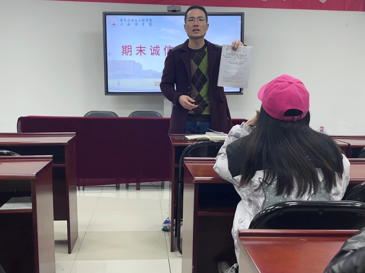 为加强考风考纪教育、安全教育,增强同学们诚信意识、安全防护意识,确保同学们诚信应考,度过一个平安、快乐的假期,12月28-29日,太阳集团tcy8722组织召开期末诚信和假期安全教育大会,太阳集团tcy8722学工办主任陈婷婷、副主任郑行、负责安全工作辅导员出席,全体员工干部参加。