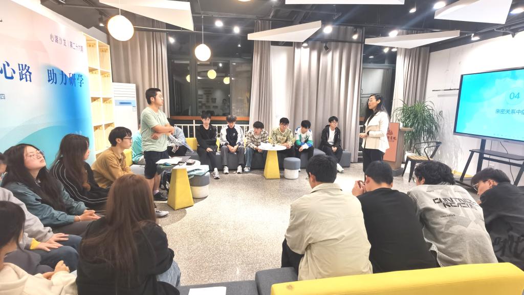 董立达首先对李敏老师进行了介绍,对她的到来表示了感谢。活动正式开始后,李敏老师带领大家做了“我是谁”的暖场小游戏,同学们迅速拉近了距离,熟悉了彼此,现场氛围热烈、活泼,沙龙在同学们的欢笑声中正式开始。李老师从“什么是亲密关系?”开始,通过精心准备的PPT,层层深入,引导同学们分享了各自对于亲密关系和亲密关系中倾听的定义和看法。接着,李老师引出了“亲密关系能带给你什么、亲密关系中的误区、如何进行亲密关系中的互动”等问题,同学们纷纷结合自身经历交流了在与亲人和恋人相处中遇到的困惑和困扰,李老师引导其他同学给出了分析和建议,李老师做最后总结。在不同观点的碰撞中,同学们时而思索、时而点头、时而微笑,有疑惑的同学表示豁然开朗,有想法的同学得到了鼓励和肯定。最后,同学们分享了在此次心理沙龙上的收获和感悟,他们表示,在亲密关系中,维持关系的平衡、换位思考和改变自己是拥有健康、治愈的亲密关系的关键。大家纷纷表示,这次活动形式新颖,内容丰富,促进了自我探索,加深了自我认识。活动在合影留念中落下帷幕。