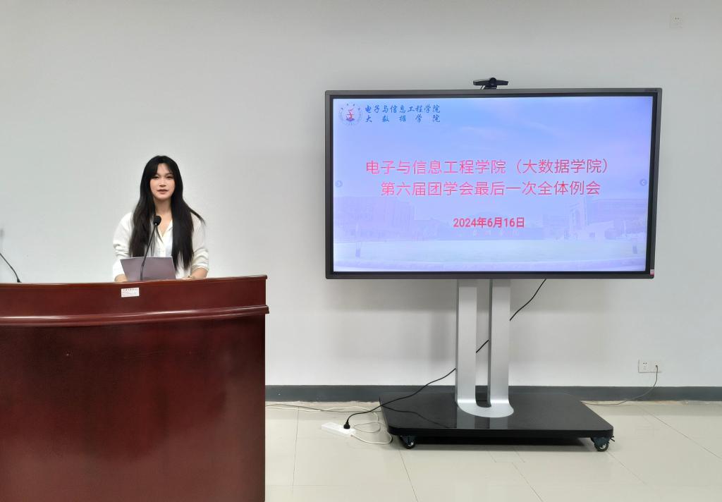 大会第二项,分团委书记代雅倩致辞。她总结并肯定了团学会在上一学年所取得的工作成果,感谢大家的辛勤付出。并鼓励同学们进一步提高学习能力和工作能力,认清职能定位,加强责任意识和奉献精神,提高纪律意识,强调要加强团学组织意识形态建设,强化团结合作。希望同学们能发扬协作精神,彰显公司良好形象,努力成为一名具有“家国情怀、垦荒之志、扎实本领”的高素质应用型人才。
