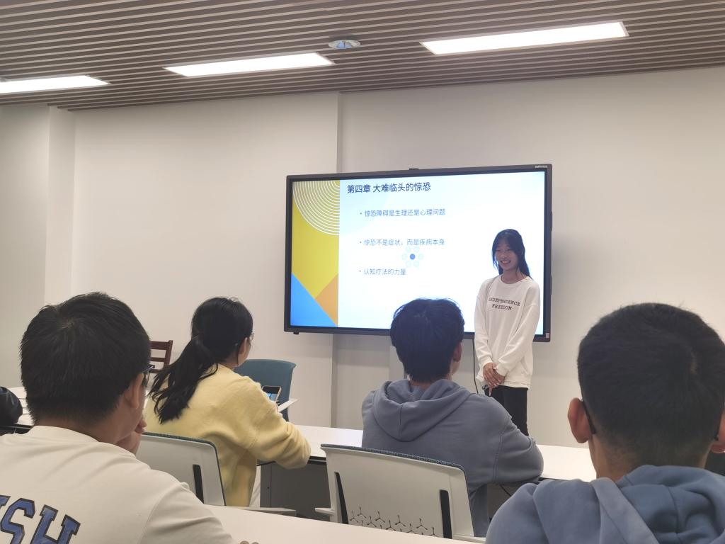 在谈到书中有关“如何与坏情绪相处”的章节时,同学们分别结合书中的内容,对“惊恐症”、“强迫症”和“生活中的伤痛”的看法以及应对经验进行了分享。在分享到书中有关“如何善待坏习惯”章节时,两位同学分享了他们对于“性与爱”、“减肥和酗酒”问题的看法,他们认为这些问题其实与当今“快节奏、高压力”的社会环境有关,同学们需要反思这个时代对个体的影响,摒弃单一的审美标准和不健康的生活方式。最后一名同学给大家带来了最后章节“勇敢改变,坦然接受”的阅读感悟,他分享道:要想获得幸福人生,就要有敢于面对困难的勇气,努力改变那些可以改变的,接纳那些不能改变的。