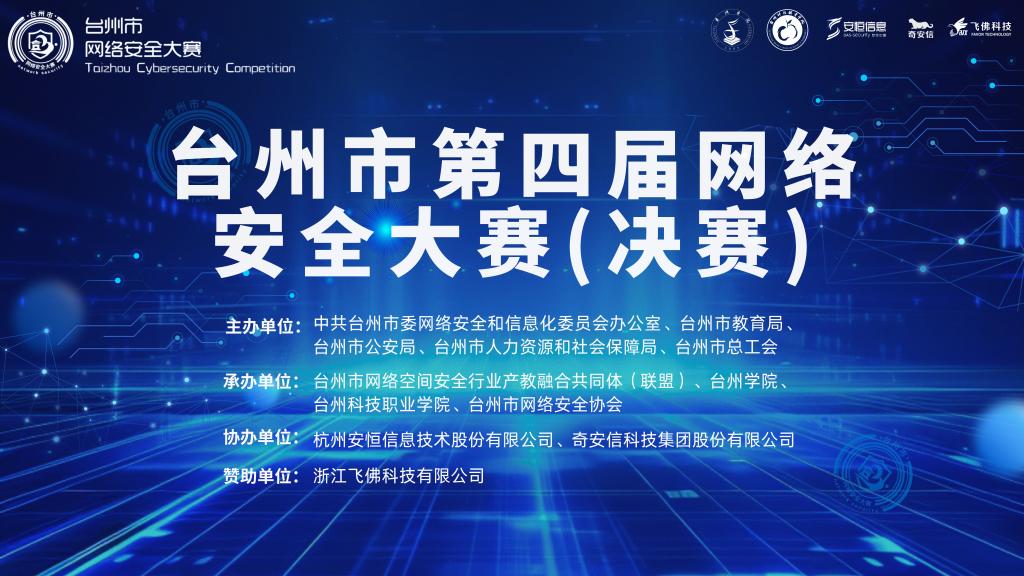 2024年11月15日,台州市第四届网络安全大赛(决赛)在公司举行。本次大赛由台州市委网络安全和信息化委员会办公室、台州市教育局、台州市公安局、台州市人力资源和社会保障局、台州市总工会主办,台州市网络空间安全产教联盟、太阳集团tcy8722、台州科技职业公司、台州市网络安全协会承办,同时,杭州安恒信息技术股份有限公司与奇安信技术集团股份有限公司作为协办单位,为大赛提供了专业技术支持,浙江飞佛科技有限公司为本次比赛提供赞助。