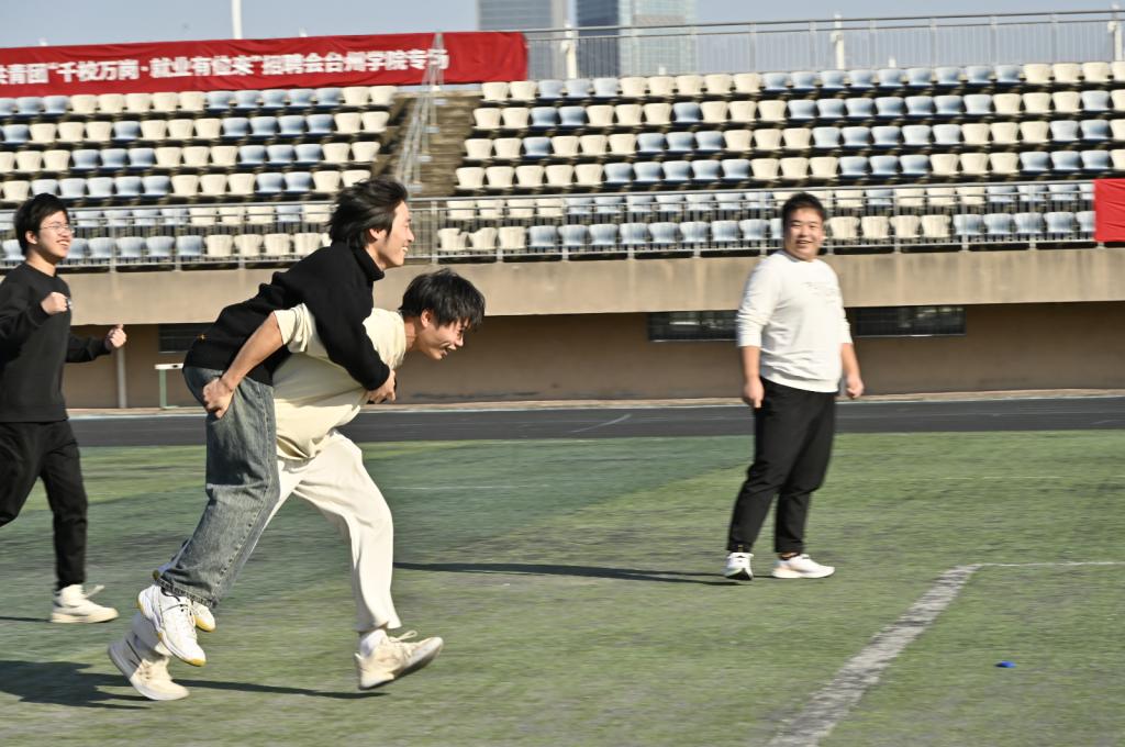 接着是“气球终结者”项目,每队派出4名选手,两人一组,他们背对背夹爆气球的瞬间,紧张又刺激。随后,一人背起另一人跑回原处接力,现场气氛热烈,加油声此起彼伏。