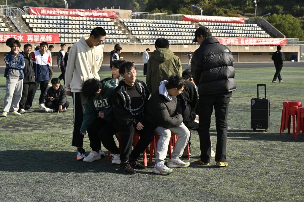 同学们在“椅子快跑”项目中,也不甘示弱。15张凳子组成圆形,裁判播放音乐,两队人围着圆形转圈。口令一响,音乐停止,众人争抢椅子,现场气氛热烈,大家都在欢呼雀跃。