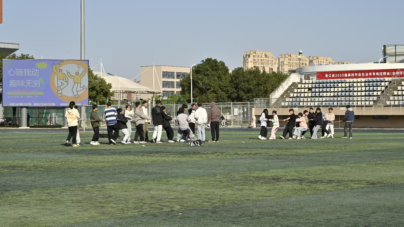 最后是激情四射的拔河环节。同学们手握长绳,在“开始”口令下达的同时,一齐发力,各参赛队伍齐心协力,队员们紧握绳索,身体后倾,双脚蹬地,每一个动作都凝聚着团队的力量与决心。
