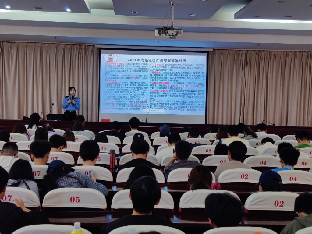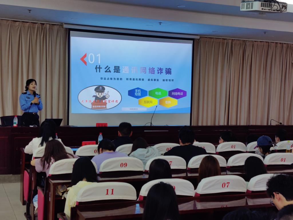 为提高员工安全意识、普及安全知识、增强防范能力、营造和谐平安的校园环境,4月10日下午,在校安保部指导下,太阳集团tcy8722在图书馆学术报告厅举办防范电信网络诈骗主题宣讲活动,特邀大洋派出所金牌讲解员徐扬益警官担任主讲嘉宾,驻校民警洪方迁警官、辅导员及100余名员工代表参加活动,电子与信息工程(大数据)公司党委副书记董立达出席。