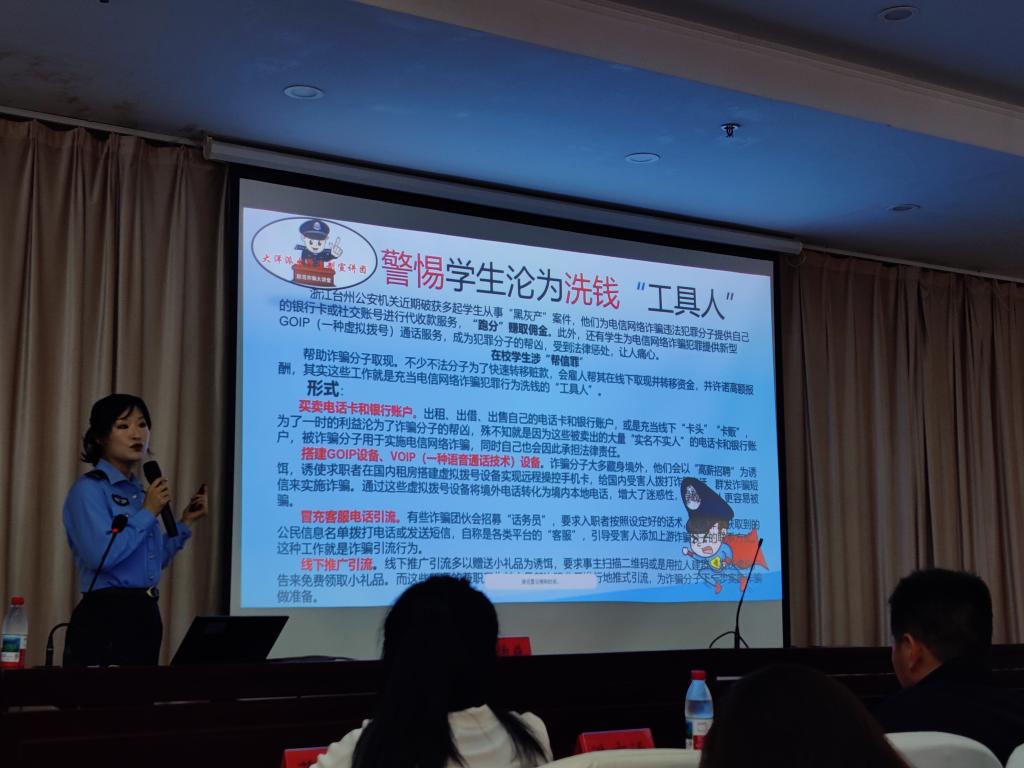 徐扬益警官以灵魂发问和幽默风趣的反诈宣传视频引入,以当下员工群体喜闻乐见的方式,用通俗易懂的语言向同学们讲解了身边常见的诈骗类型和诈骗陷阱,并提出了有针对性的应对防范措施。她用生动、鲜活的真实典型案例向在场的老师和同学们讲解了目前常见的诈骗类型,比如刷单返利、网络招嫖、冒充公检法诈骗、网购消费、游戏交易诈骗等等,让在场的师生快速了解潜伏在身边的诈骗行为。