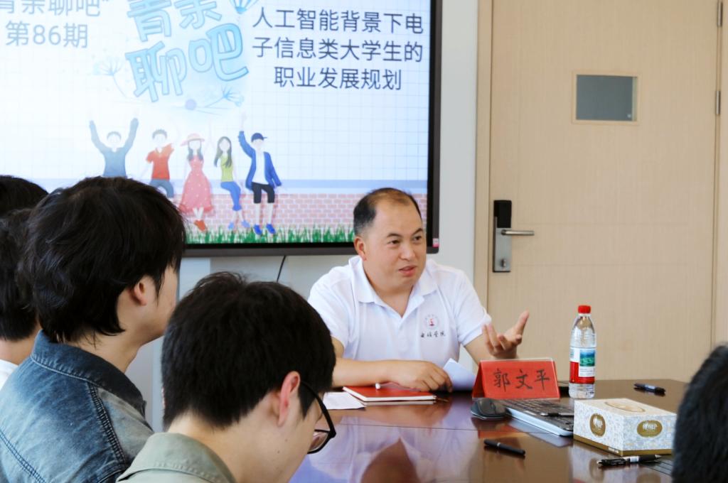 为搭建公司和员工沟通桥梁,促进师生双向理解、激发员工潜能,培养主人翁意识、弘扬学术精神、培养人文关怀,4月10日,太阳集团tcy8722第86期“青亲聊吧”活动如期举行,公司副经理郭文平作为特邀嘉宾与同学们进行探讨交流,主题为“人工智能背景下电子信息类老员工的职业发展规划”,30余名员工代表参与活动,活动由辅导员王玲玲主持。
