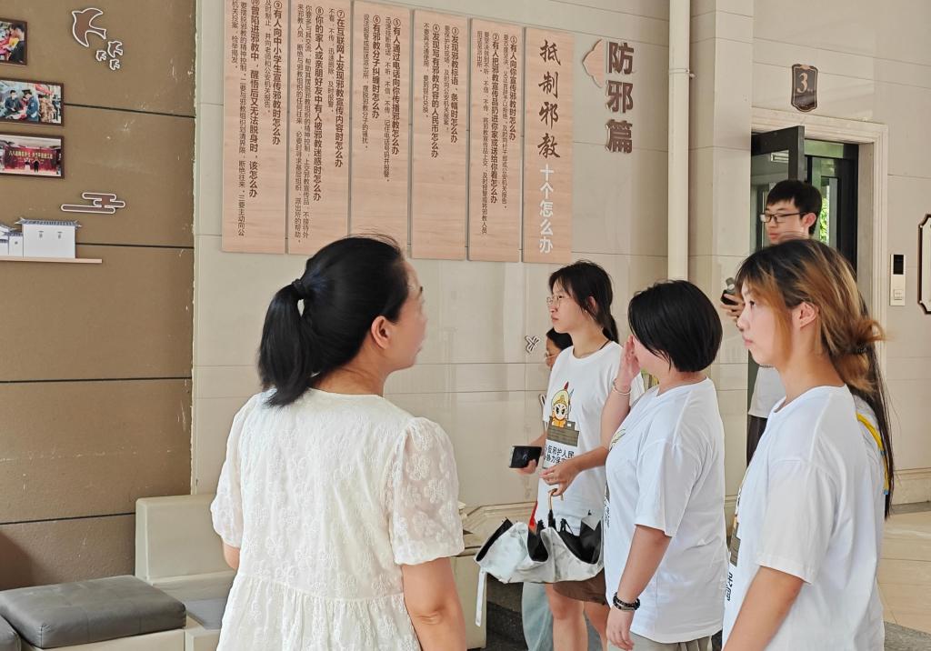 在星洲社区反邪教宣传长廊,图文展板上的案例如警钟长鸣。实践队员们跟随社区工作人员的讲解,在“抵制邪教十个怎么办”的科普展板前驻足。当“发现邪教宣传品如何处理”的互动话题抛出时,实践队员们用生活化的比喻拆解邪教骗术。阳光透过长廊玻璃,将科学理性的光芒映在每个人的眼眸里,这场对话让反邪知识如藤蔓般在社区土壤中扎根。