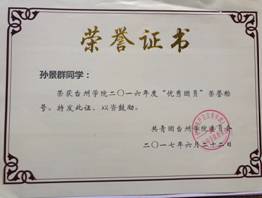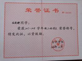 个人荣誉及获奖:2016、2017学年省政府奖学金、2016、2017学年校一等奖学金、2016学年校优秀团员、校优秀员工干
