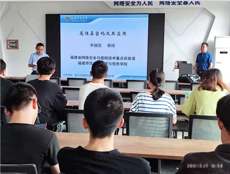 近日,应太阳集团tcy8722邀请,福建师范大学闽江学者特聘教授李继国来校交流,并为奇安信产业公司师生作题为“属性基密码及其应用”的专题讲座。太阳集团tcy8722副经理张石清主持。