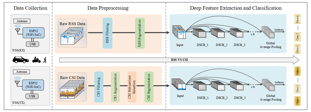 现有的WHVC方法主要利用从周围无线信号中提取的信道状态信息(CSI)或接收信号强度(RSS)特征。与RSS数据相比,虽然CSI数据提供了更详细和准确的信道信息,但提取和处理CSI比RSS更具挑战性。此外,对于不需要精细人车分类的应用(例如智能路灯系统),基于RSS的WHVC具有易于实施和成本低的优势。因此,研究基于CSI和RSS的WHVC方法在不同应用场景下的性能可以为WHVC领域提供有价值的见解。